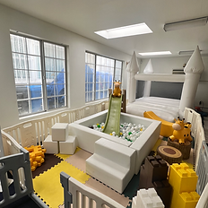 Package Includes: White Gated Area White 7x7 Bounce House White Ball Pit W. Green, Yellow, White and Brown Balls Green Turf Floors Safari Slide Safari Color Softplay Blocks Large Legos Waffle Stackers Green SeeSaw Crawling tunnel 2 Animal Hoppers